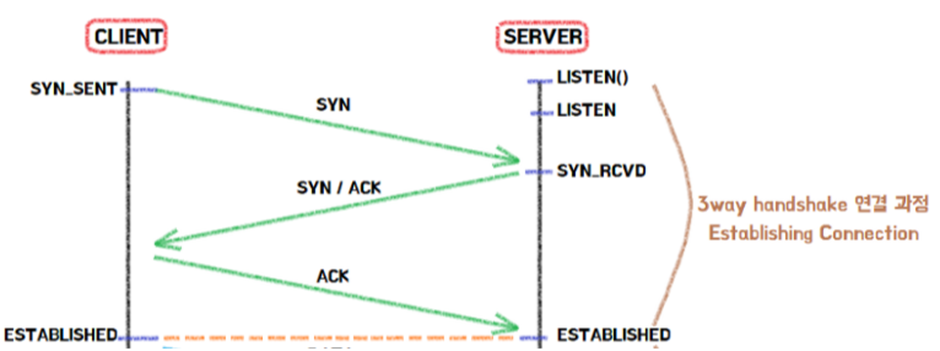 TCP 통신을 위한 네트워크 연결은 3 way handshake 라는 방식으로 연결된다. 3 way handshake 방식은 서로의 통신을 위한 관문(port)을 확인하고 연결하기 위하여 3번의 요청/응답 후에 연결이 되는 것을 말한다. (이 과정에서 가장 많은 시간이 소요되어 UDP방식보다 속도가 느려지는 주요 원인으로 지목된다.)