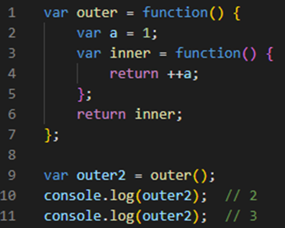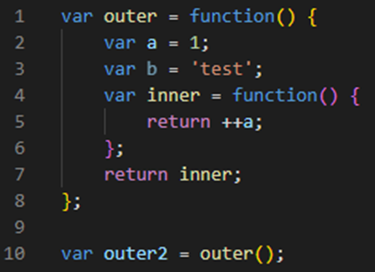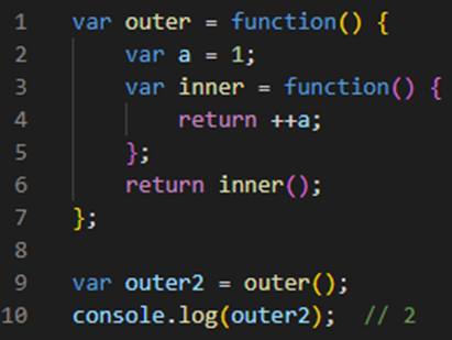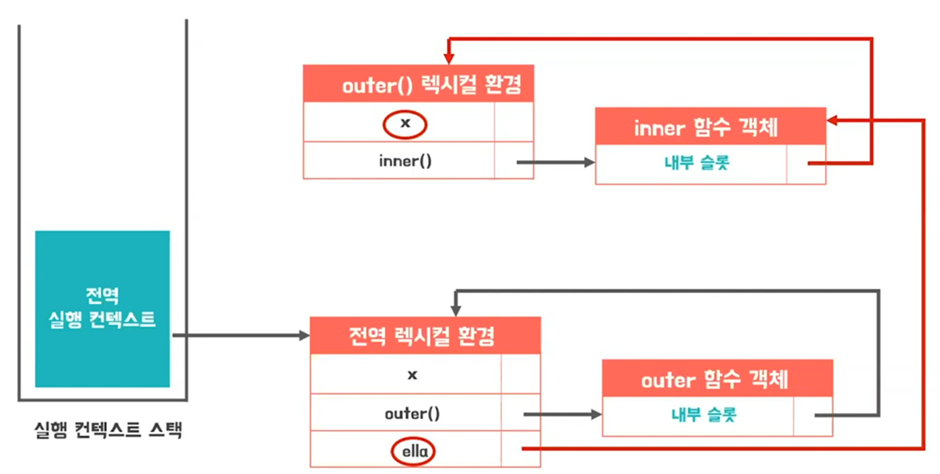 - 위 코드에서 9번째 line이 실행되고 outer 함수의 실행 컨텍스트가 종료되었을 때 outer2 변수는 inner 함수를 참조하게 됨