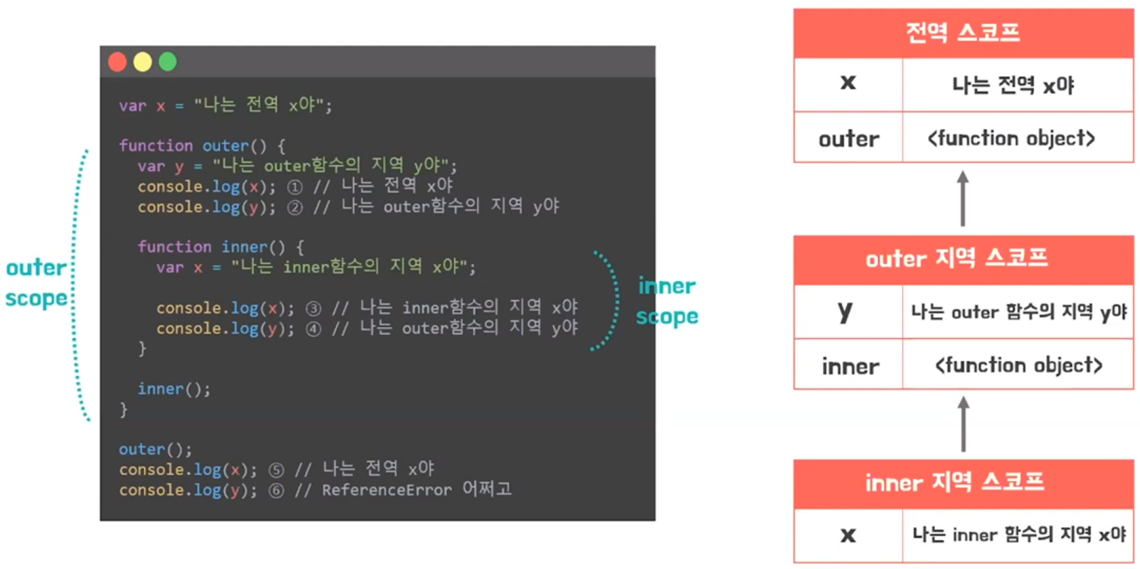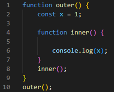 - inner 함수에 a가 선언되어 있지 않으나 상위 스코프에 접근해서 a를 찾아냄