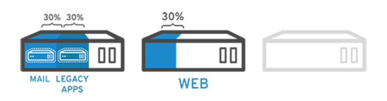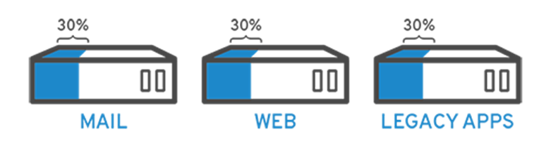 다음과 같은 상황을 가정하자. 각각 용도가 다른 3개의 물리 서버(메일 서버, 웹 서버, 내부 레거시 서버)가 있다. 각 서버는 잠재적인 실행 용량의 일부에 불과한 30% 용량만 사용하고 있다. 그러나 내부 운영을 위해서는 레거시 애플리케이션이 계속 필요하므로 레거시 어플리케이션과 이를 호스팅하는 세 번째 서버를 유지해야 한다.