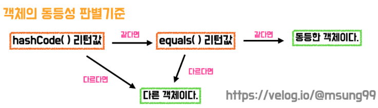 그런데 논리적 동등성을 비교할 때 hash 값을 사용하는 컬렉션(HashSet, HashMap, HashTable) 은 객체가 논리적으로 동일한지 hashCode() 값을 먼저 비교하고, 이후에 equals() 를 비교한다.