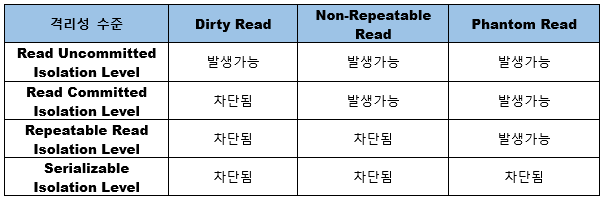 - 가장 높은 격리 수준으로, 부정 판독(Dirty Read), 비반복 판독(Nonrepeatable Read), 가상 판독(Phantom Read) 모두 방지됨