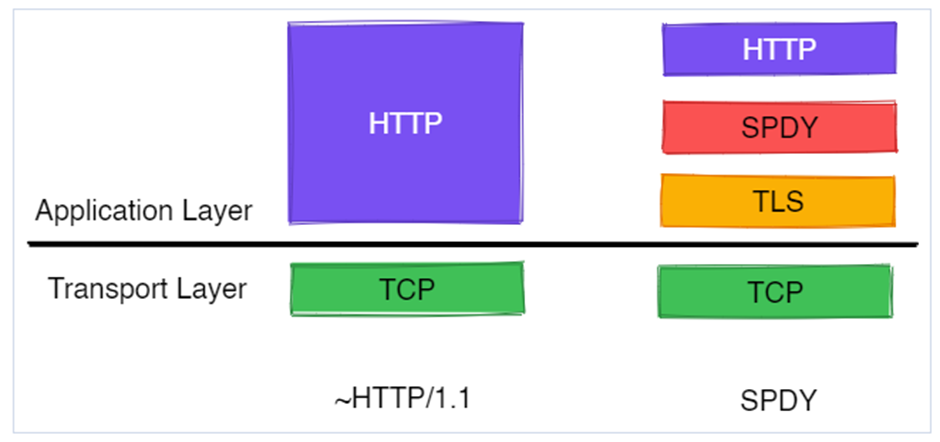 SPDY는 HTTP와는 완전 별개의 프로토콜이 아니라 TLS 위에서 동작하는 프로토콜로, HTTP 요청을 보내면 이를 SPDY 요청으로 변환하여 서버에 날리고, 응답을 다시 HTTP로 변환하는 방식으로 동작한다.