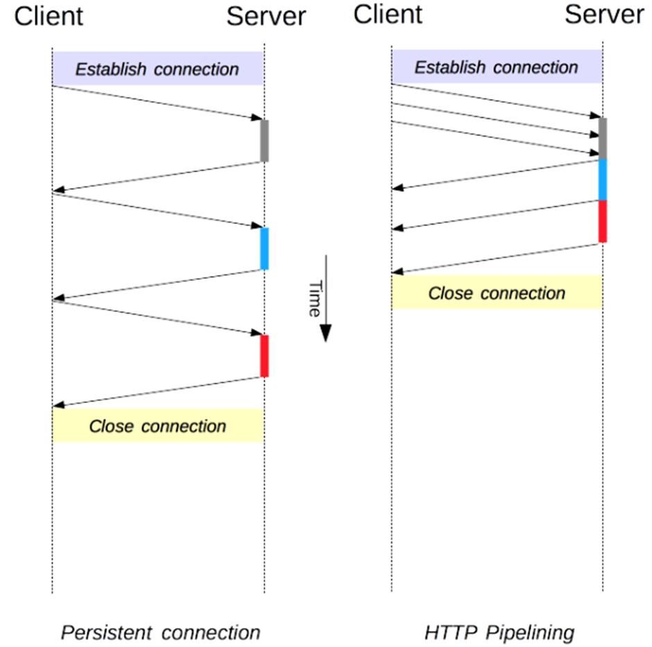 - Pipelining : 앞 요청의 응답을 기다리지 않고 순차적인 여러 요청을 연속적으로 보내고 그 순서에 맞춰 응답을 받는 방식