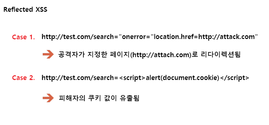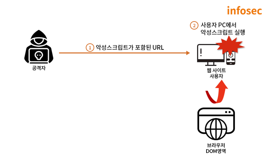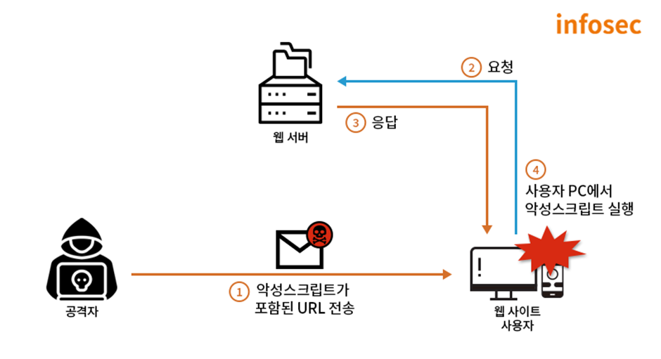 공격자의 악성 스크립트가 데이터베이스와 같은 저장소에 별도로 저장되지 않고 사용자의 브라우저에서 즉시 실행되면서 피해가 발생한다.