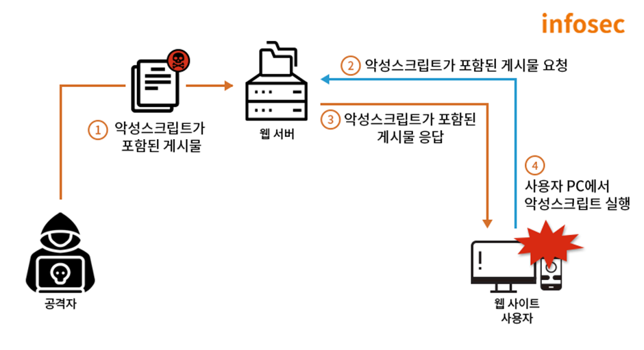 공격자는 악성스크립트가 포함된 게시물을 작성하여 게시판 등 사용자가 접근할 수 있는 페이지에 업로드한다. 이때 사용자가 악성스크립트가 포함된 게시물을 요청하면, 공격자가 삽입한 악성스크립트가 사용자 측에서 동작하게 된다. 공격자의 악성스크립트가 서버에 저장되어 불특정 다수를 대상으로 공격에 이용될 수 있어 Reflected XSS보다 공격 대상의 범위가 훨씬 크다.