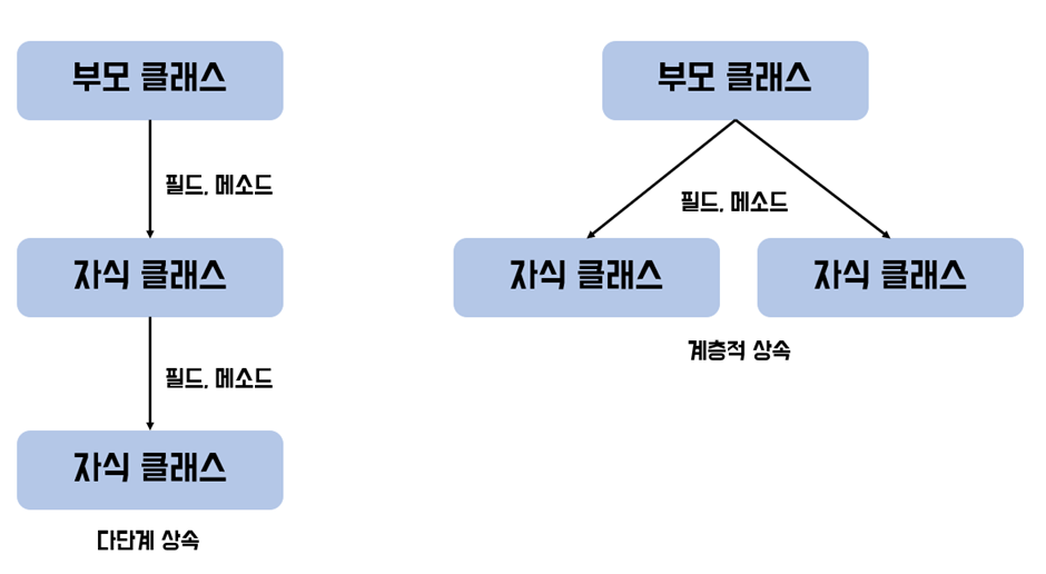 상속 방식은 주로 다단계 상속, 계층적 상속 두 가지 방식을 띄게 되는데 부모 클래스를 통해 자식, 손자까지 내려가는 방식을 다단계 상속이라고 하며 하나의 부모가 여러 개의 자식을 가지는 것을 계층적 상속이라고 한다.