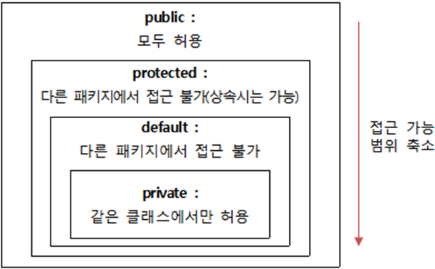 - 같은 패키지 내 클래스 or 다른 패키지에 있는 자식 클래스에서만 접근 가능 - default (다른 말로 package-private)
