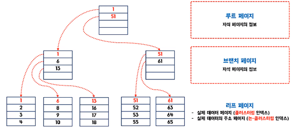 - 리프 페이지에 실제 데이터 페이지 주소를 담고 있다.