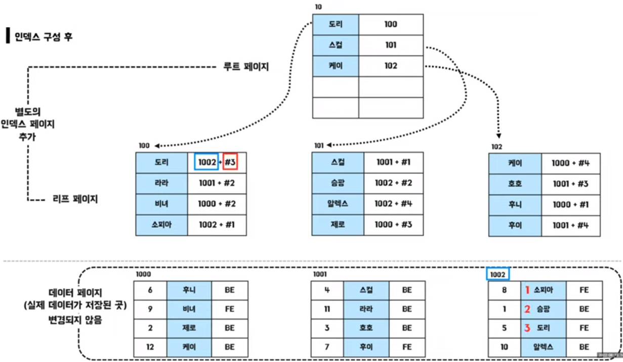 - 별도의 인덱스 페이지를 생성한다 -> 추가 공간 필요