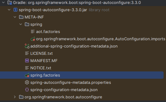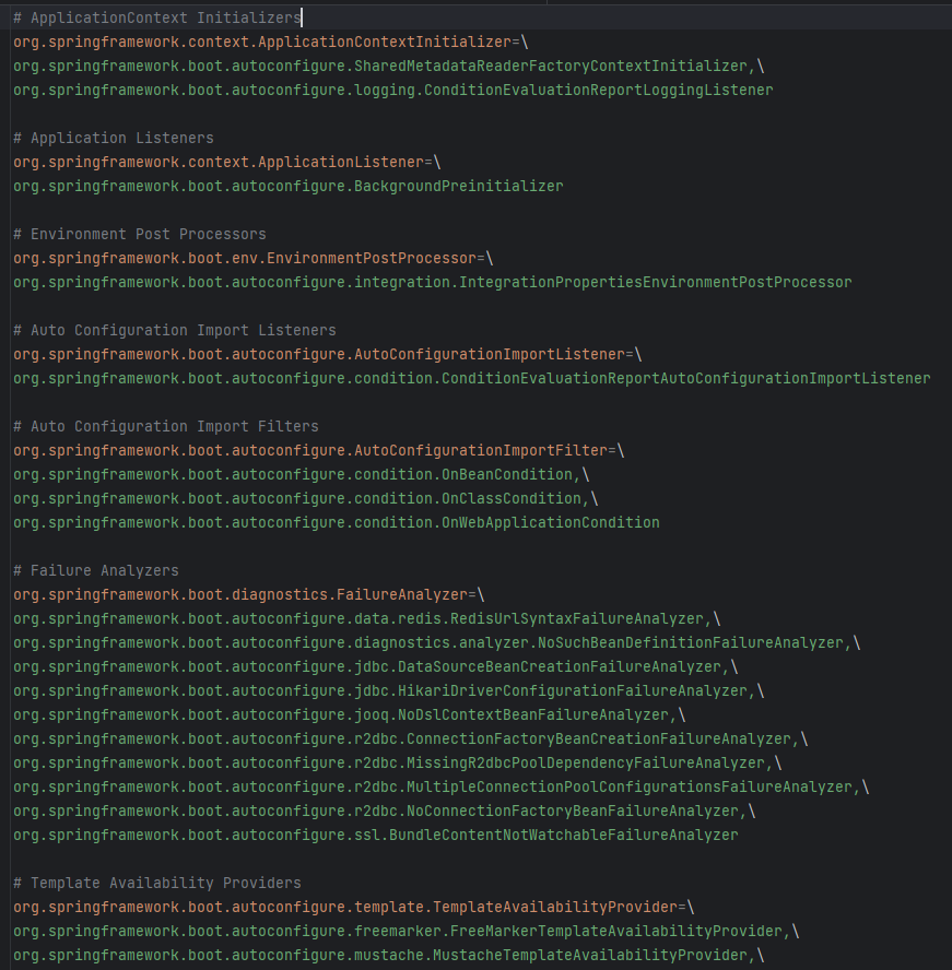 spring.factories 파일 내에는 다양한 자동 구성 클래스, 리스너, 포스트 프로세서 등이 나열되어 있다. @Import(AutoConfigurationImportSelector.class) 어노테이션이 spring.factories 파일에서 자동 구성 클래스 목록을 가져오는데, 이때 각 자동 구성 클래스는 특정 조건에 따라 활성화되며 필요한 bean들을 자동으로 등록한다.