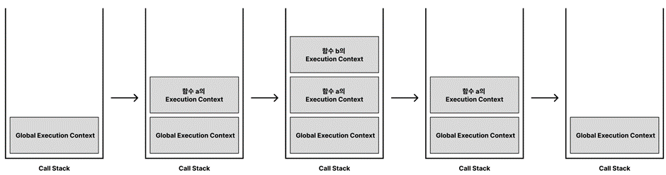 이전과 똑같이 콜 스택 최상단에 b 실행 컨텍스트가 있기에 기존 a 실행 컨텍스트와 관련된 코드의 실행을 일시적 중단한다. - b 함수가 종료된 후 b 실행 컨텍스트가 콜 스택에서 제거된다.