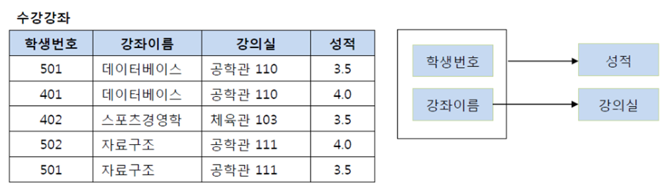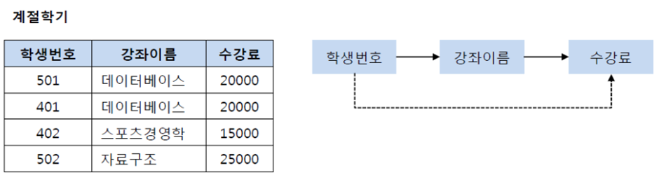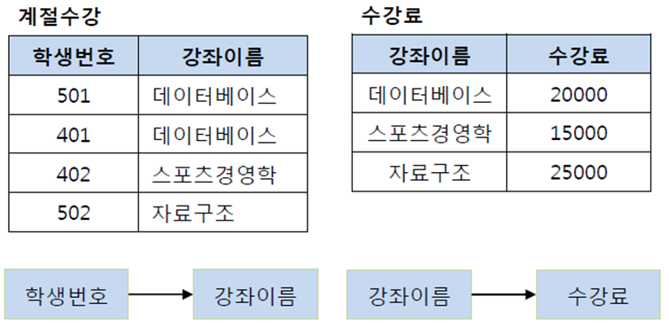 이행적 종속을 제거하는 이유는 비교적 간단하다. 예를 들어 501번 학생이 수강하는 강좌가 스포츠경영학으로 변경되었다고 하자. 이행적 종속이 존재한다면 501번의 학생은 스포츠경영학이라는 수업을 20000원이라는 수강료로 듣게 된다. 물론 강좌 이름에 맞게 수강료를 다시 변경할 수 있지만, 이러한 번거로움을 해결하기 위해 제3 정규화를 하는 것이다. 즉, 학생 번호를 통해 강좌 이름을 참조하고, 강좌 이름으로 수강료를 참조하도록 테이블을 분해해야 하며 그 결과는 다음의 그림과 같다.