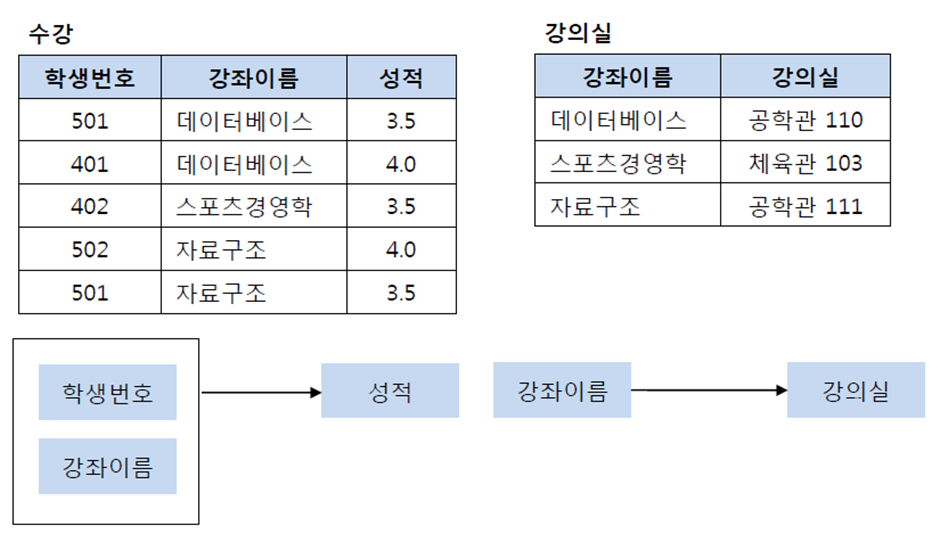 이 테이블에서 기본키는 (학생번호, 강좌이름)으로 복합키이다. 그리고 (학생번호, 강좌이름)인 기본키는 성적을 결정하고 있다. 그런데 여기서 강의실이라는 컬럼은 기본키의 부분집합인 강좌이름에 의해 결정될 수 있다. 즉, 기본키(학생번호, 강좌이름)의 부분키인 강좌이름이 결정자이기 때문에 위의 테이블의 경우 다음과 같이 기존의 테이블에서 강의실을 분해하여 별도의 테이블로 관리하여 제2 정규형을 만족시킬 수 있다.