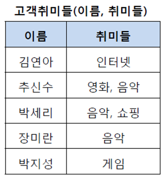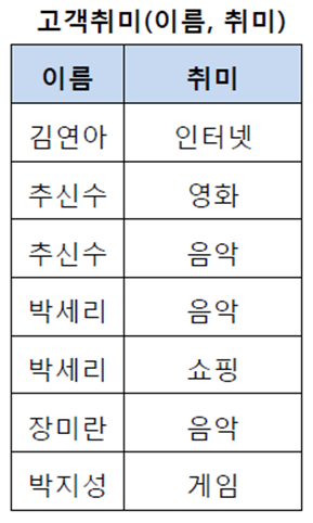 제1 정규화란 테이블의 컬럼이 원자값(Atomic Value, 하나의 값)을 갖도록 테이블을 분해하는 것을 의미한다. 예를 들어 아래와 같은 고객 취미 테이블이 존재한다고 하자.
