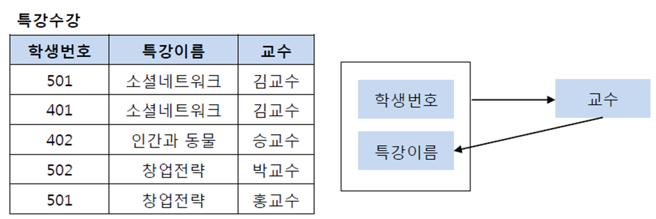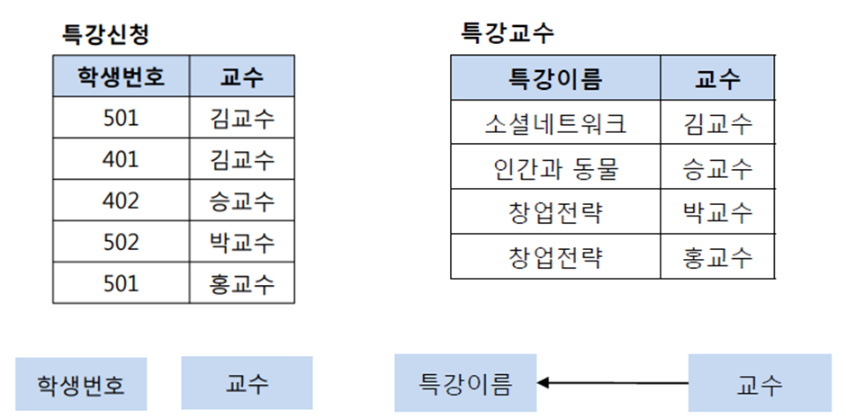 특강수강 테이블에서 기본키는 (학생번호, 특강이름)이다. 그리고 기본키 (학생번호, 특강이름)는 교수를 결정하고 있다. 또한 여기서 교수는 특강이름을 결정하고 있다. 그런데 문제는 교수가 특강이름을 결정하는 결정자이지만, 후보키가 아니라는 점이다. 그렇기 때문에 BCNF 정규화를 만족시키기 위해서 위의 테이블을 분해해야 하는데, 다음과 같이 특강신청 테이블과 특강교수 테이블로 분해할 수 있다.
